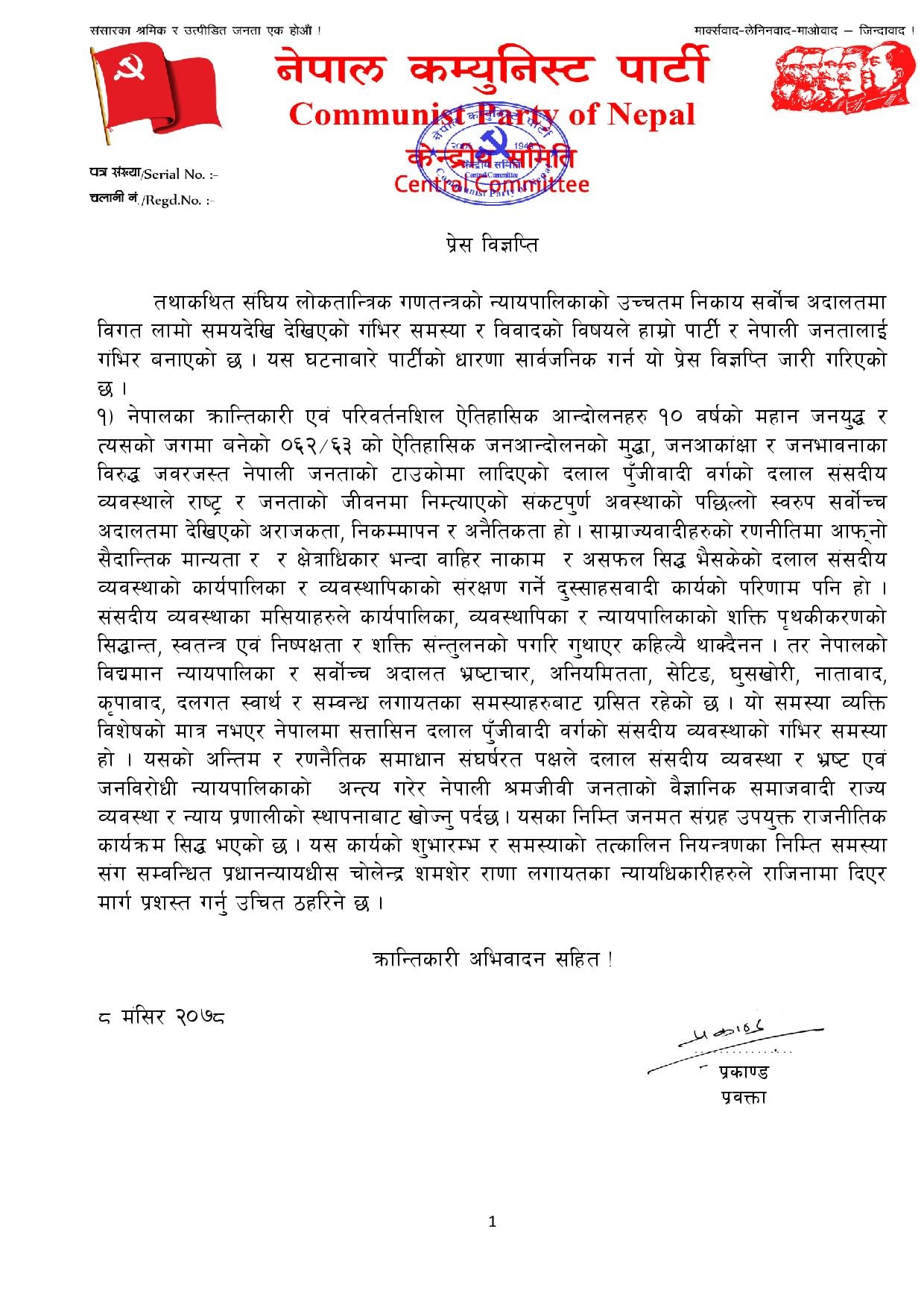 पार्टीले भनेको छ, “यो समस्या व्यक्ति विशेषको मात्र नभएर नेपालमा सत्तासिन दलाल पुँजीवादी वर्गको संसदीय व्यवस्थाको गंभिर समस्या हो । यसको अन्तिम र रणनैतिक समाधान संघर्षरत पक्षले दलाल संसदीय व्यवस्था र भ्रष्ट एवं जनविरोधी न्यायपालिकाको अन्त्य गरेर नेपाली श्रमजीवी जनताको वैज्ञानिक समाजवादी राज्य व्यवस्था र न्याय प्रणालीको स्थापनाबाट खोज्नु पर्दछ ।”
