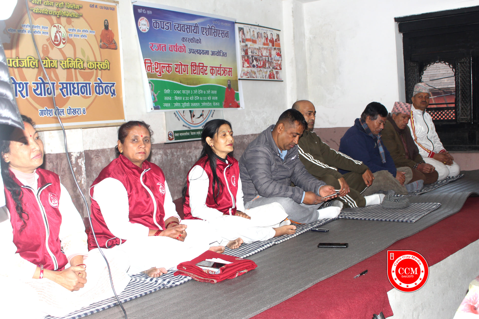 कपडा व्यवसायी एशोसियसन कास्कीको रजत वर्षको अवसरमा पाँच दिने योग शिविर सम्पन्न भएको छ । पतन्जली योग समिति कास्की अन्तरगतको गणेश योग केन्द्र पोखरामा सम्पन्न उक्त शिविरमा कपडा व्यवसायीहरु लगायतले सहभागीता जनाएका थिए ।
