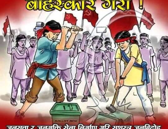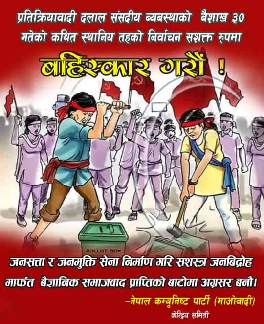 नेपाल कम्युनिष्ट पार्टी माओवादीले आगामी वैशाख ३० गते हुने स्थानिय तहको चुनाव बहिष्कार गर्ने भएको छ । वर्तमान सरकार जनताको भावना विपरित विदेशी शक्तिहरुका सामु लम्पसार परेर राष्ट्रियतालाई लिलाम गर्ने खेलमा लागेको भन्दै दलाल नोकरशाही सत्ता र सरकारले गर्ने कुनैपनि निर्वाचन आफुहरुका लागि स्विकार्य नहुने सो पार्टीका महासचिव क.नेपालद्धारा जारी विज्ञप्तीमा जनाईएको छ ।