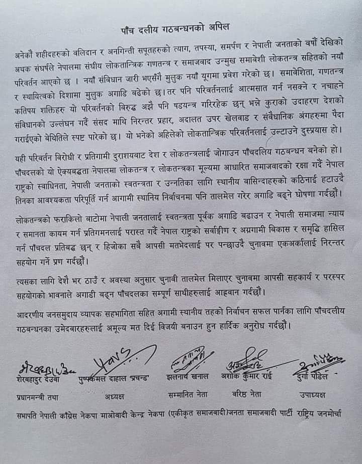 परिवर्तन र प्रतिगामी दुराशयबाट देशलाई बचाउनका लागि बनेको गठबन्धनले लोकतन्त्र र यसको मुल्यमा आधारित समाजवादको रक्षा गर्दै राष्ट्रको स्वाधिनता, नेपाली जनताको स्वतन्त्रता र उन्नतीका लागि स्थानिय जनताको कठिनाई हटाउदै उनिहरुका आवश्यश्यकता परिपुर्तिका लागि स्थानिय तहको निर्वाचनमा आवश्यकता अनुसार तालमेल गर्ने उनिहरुले घोषणा गरेका हुन् ।