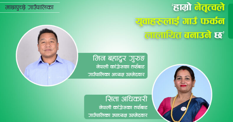 नेपाली कांग्रेसका तर्फबाट गाउँपालिका अध्यक्ष उम्मेदवार गुरुङले भने‘हाम्रो नेतृत्वले युवाहरुलाई गाउँमै फर्काउने छ । विकासका कुरा होस् या रोजगारीका कुरा, त्यो वातावरण हामी यहिँ सिर्जना गर्ने गरि योजना अघि बढाउने छौँ ।हाम्रो नेतृत्वले युवाहरुलाई गाउँ फर्कन लालायित बनाउने छ ।’ अथाह सम्भावना भएको पर्यटन क्षेत्रलाई चलायमान बनाउँदै पालिकाबासीको आर्थिक स्तरोन्नतीमा प्रत्यक्ष भूमिका खेल्नेगरि योजना तयार भएको उनको भनाई छ ।
