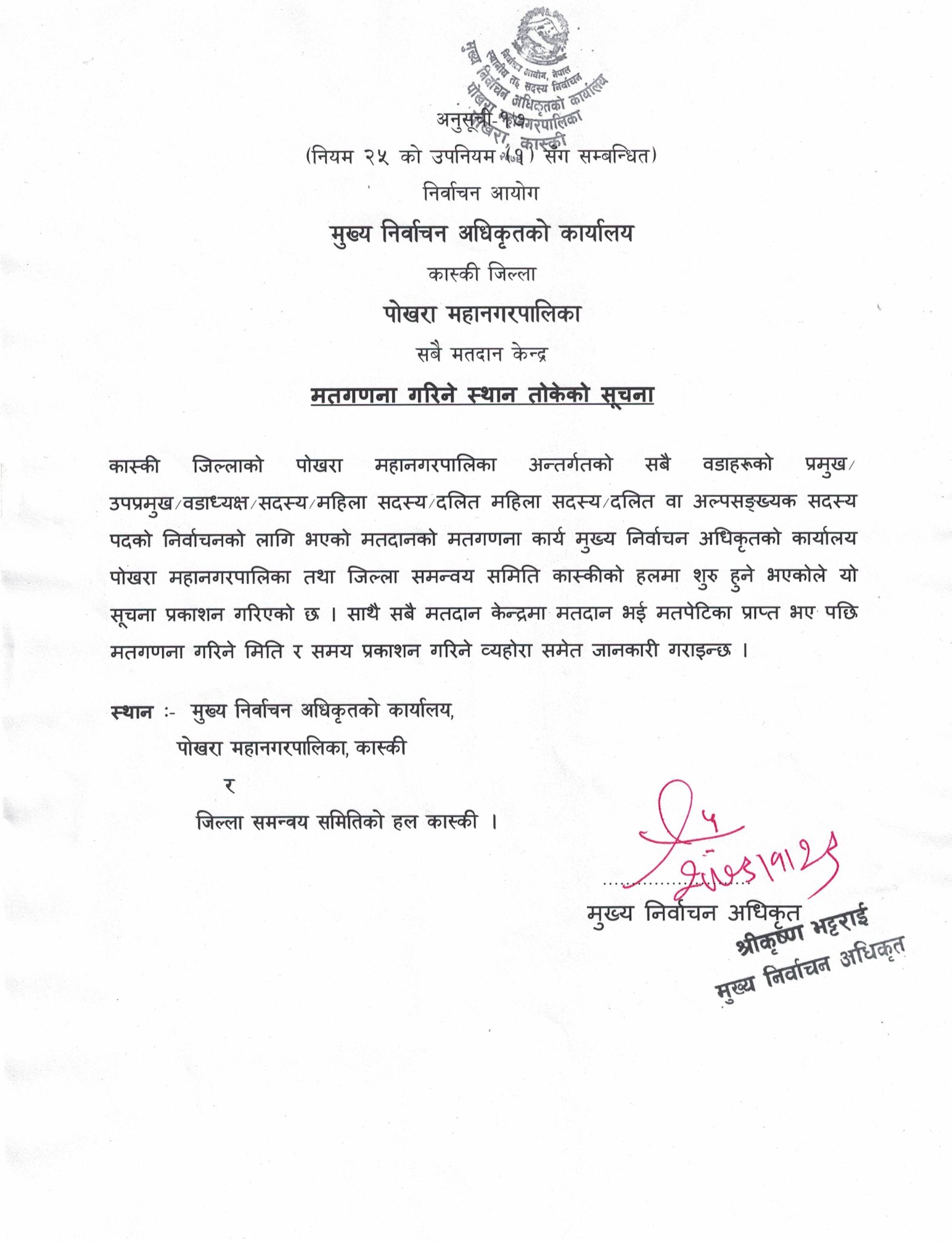 पोखरा महानगरपालिकाको मतगणना जिल्ला समन्वय समितिको कार्यालयमा हुने भएको छ ।