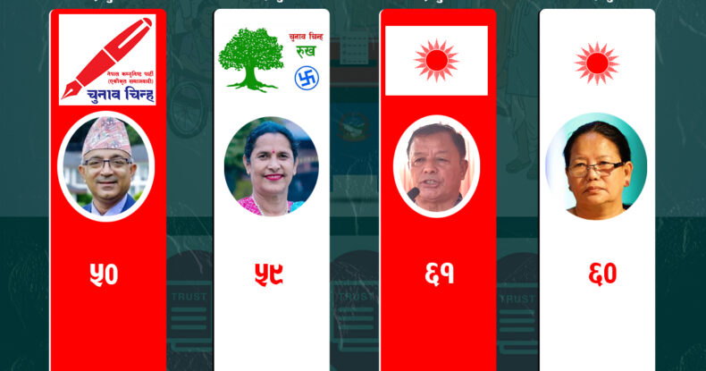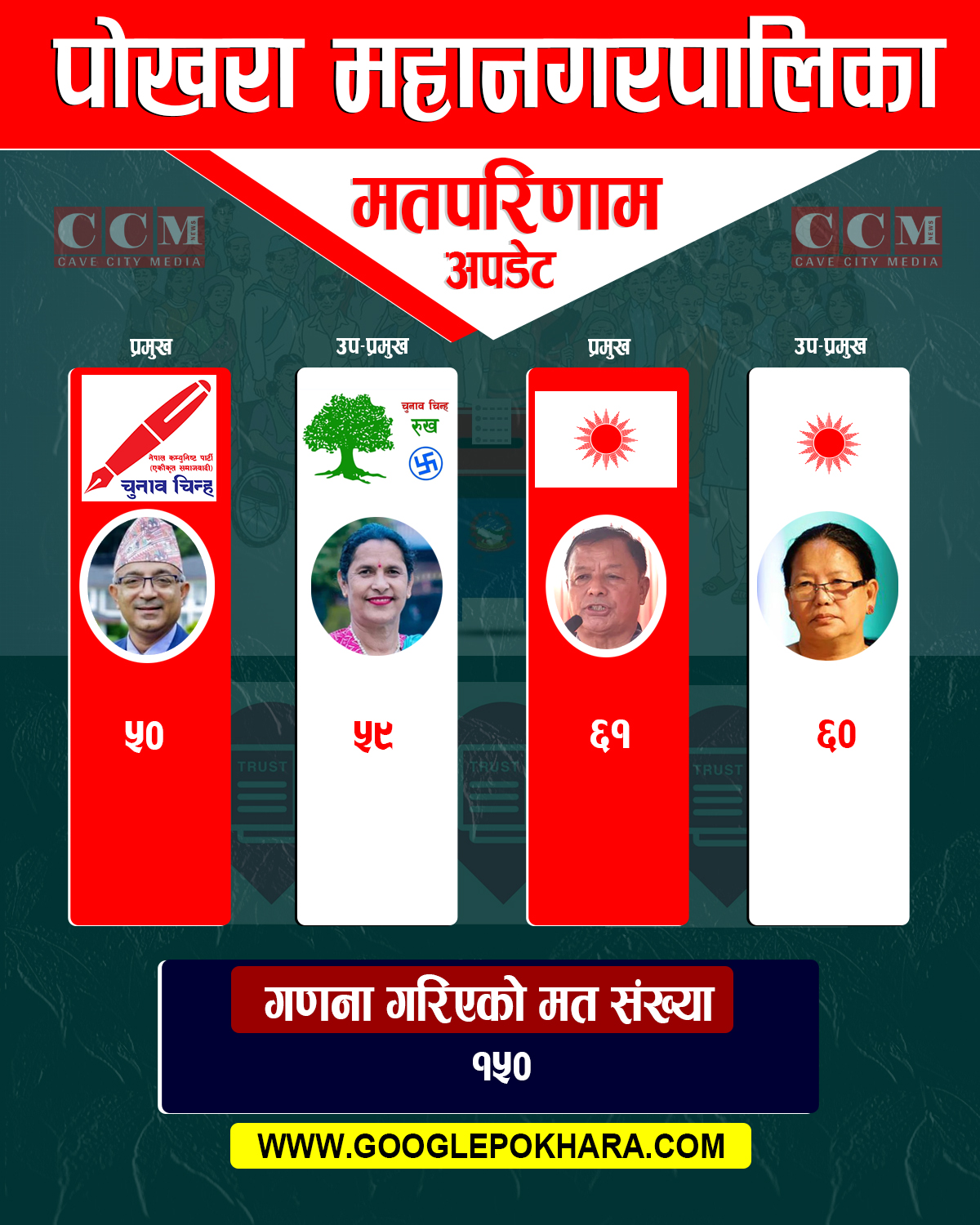 पोखरा महानगरपालिका वडा नं. १ र १२ गरि १५० मत गणना हुदाँ नेकपा एमालेका कृष्ण थापा अगाडी छन् । उनले ६१ मत प्राप्त गरेका छन् भने गठबन्धनका उमेदवार धनराज आचार्य १ मतले ५० मत प्राप्त गरेका छन् ।