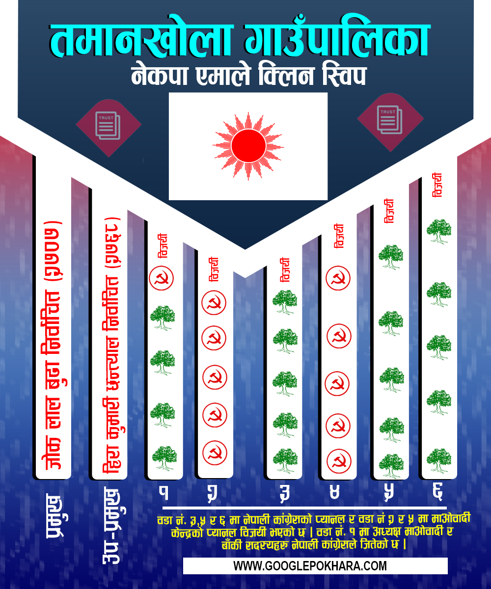 बाग्लुङको तमानखोला गाउँपालिकामा नेकपा एमाले क्लिन स्विप भएको छ । गाउँपालिका अध्यक्षमा नेपाली कांग्रेसका जोकलाल बुढा २७०७ मतका साथ विजयी भएका छन् । उनका प्रत्यासी माओवादी केन्द्रका देव बहादुर पुनले १९९५ मत प्राप्त गरे ।