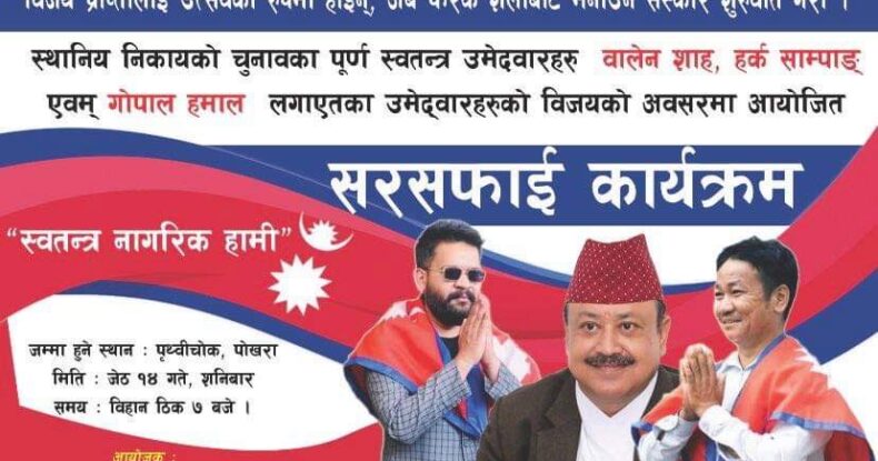 देशका प्रमुख शहरहरुमा जित हाषिल गरेका स्वतन्त्र उमेदवारहरुको सर्मथनमा शनिबार पोखरामा पनि सरफाई कार्यक्रम हुने भएको छ । वि क्यान डु पोखराको आयोजनामा वृहद सरसफाई कार्यक्रम आयोजना गरिएको संयोजक मोनिका बरालले बताईन् ।