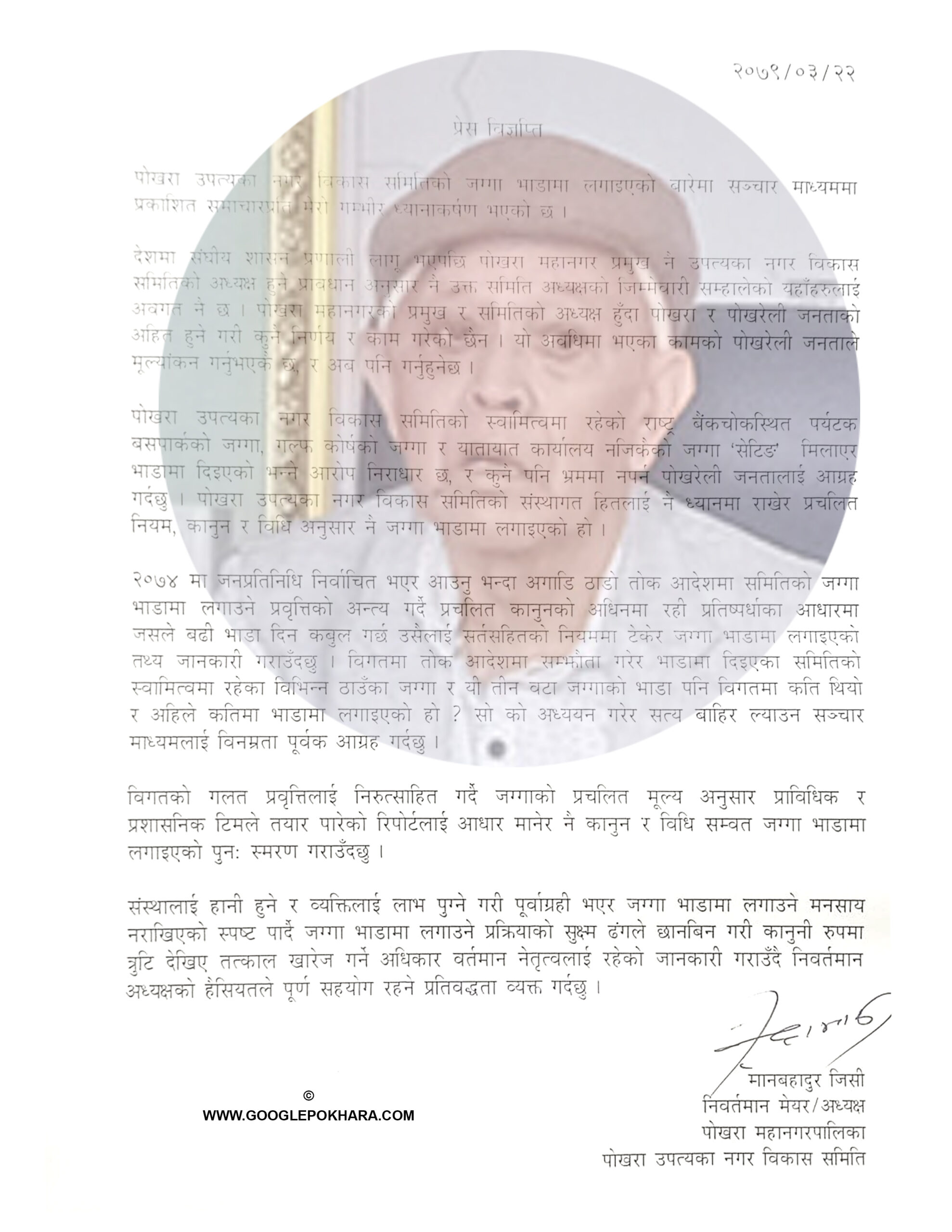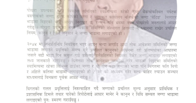 पोखरा उपत्यका नगरविकास समितिको नाममा रहेको जग्गा भाडामा लगाईएको विषयमा चर्को आलोचना भएपछि पोखरा महानगरपालिकाका निवर्तमान प्रमुख मान बहादुर जिसीले आफ्नो ध्यानाकर्षण भएको भन्दै विरोध जनाएका छन् ।