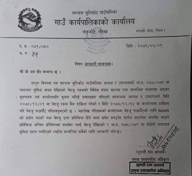 गोरखाको बारपाक सुलिकोट गाउँपालिकाका अध्यक्ष र उपाध्यक्षका सम्बन्धमा आर्थीक वर्ष २०७७/०७८ मा यातायात सुविधा शिर्षकमा देखिएको बेरुजुका विषयमा विभिन्न संचारमाध्यम तथा सामाजिक संजालमा आएका सुचना तथा समाचारहरु प्रति खण्डन सहित आफ्नो गम्भिर ध्यानाकर्षण भएको पालिकाले जनाएको छ ।