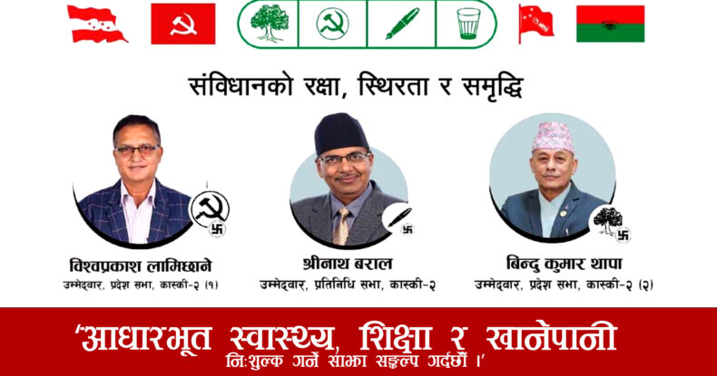 पाँच दलीय गठबन्धनको तर्फबाट कास्कीको निर्वाचन क्षेत्र नं. २ का उमेदवारहरुले संविधानको रक्षा, स्थिरता र समृद्धिका लागि निष्ठाका साथ लाग्ने साझा प्रतिबद्धता सहितको सङ्कल्प गरेका छन् । लोकतन्त्रको संस्थागत विकास, संविधानको रक्षा र स्थिर सरकार निर्माण गर्ने साझा प्रतिबद्धता सहितको सङ्कल्प उनीहरूले गरेका हुन् ।