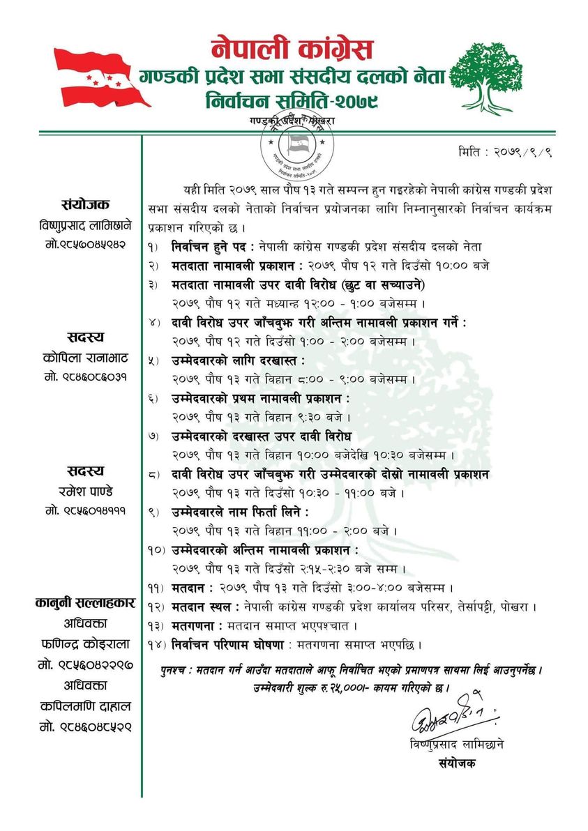 यस्तै २ः३० बजेसम्म उमेदवारको अन्तिम नामावली प्रकाशन, ४ बजेसम्म नेपाली कांग्रेसको गण्डकी प्रदेश कार्यालय तेर्सापट्टीमा मतदान हुनेछ । तत्पश्चात मतगणना गरिने छ । नेपाली कांग्रेसका गण्डकीमा २७ जना प्रदेशसभा सदस्य रहेका छन् ।