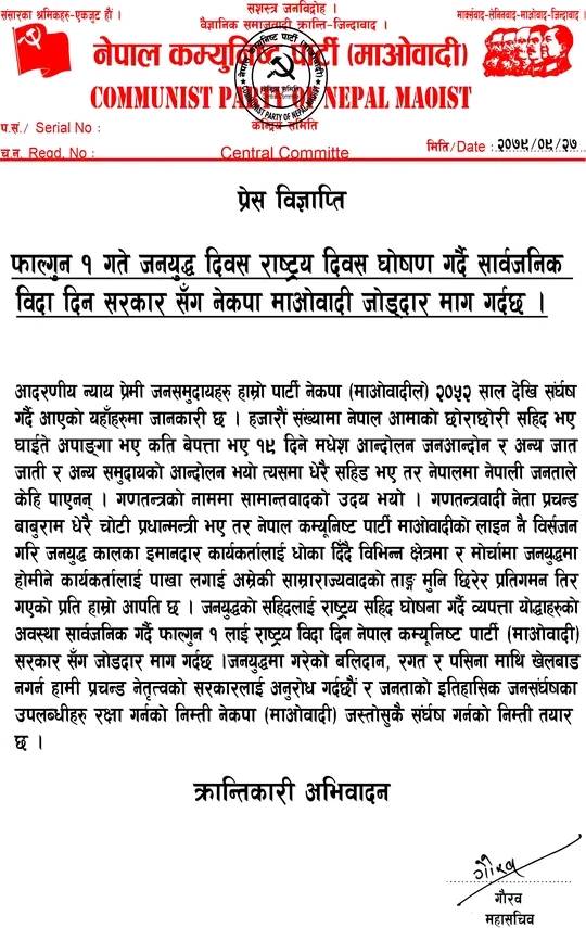 नेपाल कम्युनिष्ट पार्टी (नेकपा) ले फाल्गुन १ गतेलाई राष्ट्रिय दिवस घोषणा गर्दै सार्वजनिक विदा दिन सरकारसंग माग गरेको छ । पार्टीका महासचिव क.गौरवद्धारा जारी विज्ञप्तीमा माओवादी आन्दोलनका नाममा मुलुक र जनतालाई तत्कालिन नेतृत्वबाट गद्धारी भएको भन्दै चर्को आलोचना समेत गरिएको छ ।