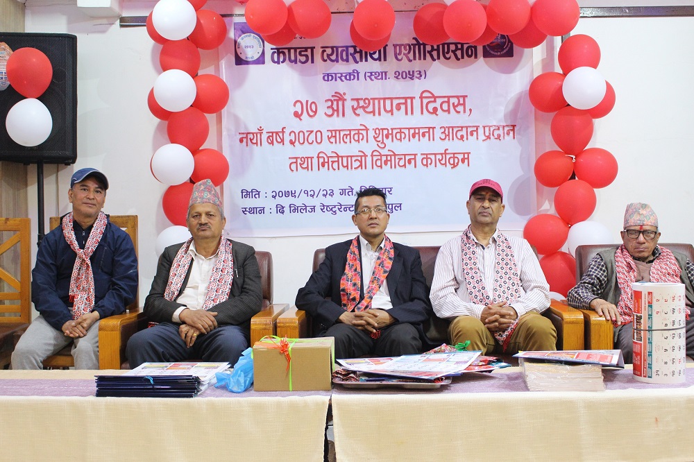 कपडा व्यवसायी एसोसिएसन कास्कीको २७ औँ स्थापना दिवस, नयाँ वर्ष २०८० सालको शुभकामना आदान प्रदान तथा भित्ते पात्रो विमोचन कार्यक्रम बिहीबार सम्पन्न भएको छ । संस्था स्थापना भएको २७ वर्ष पुरा भएको अवसरमा प्रकाशित नयाँ वर्ष २०८० सालको भित्ते पात्रोको समेत विमोचन गरिएको हो ।