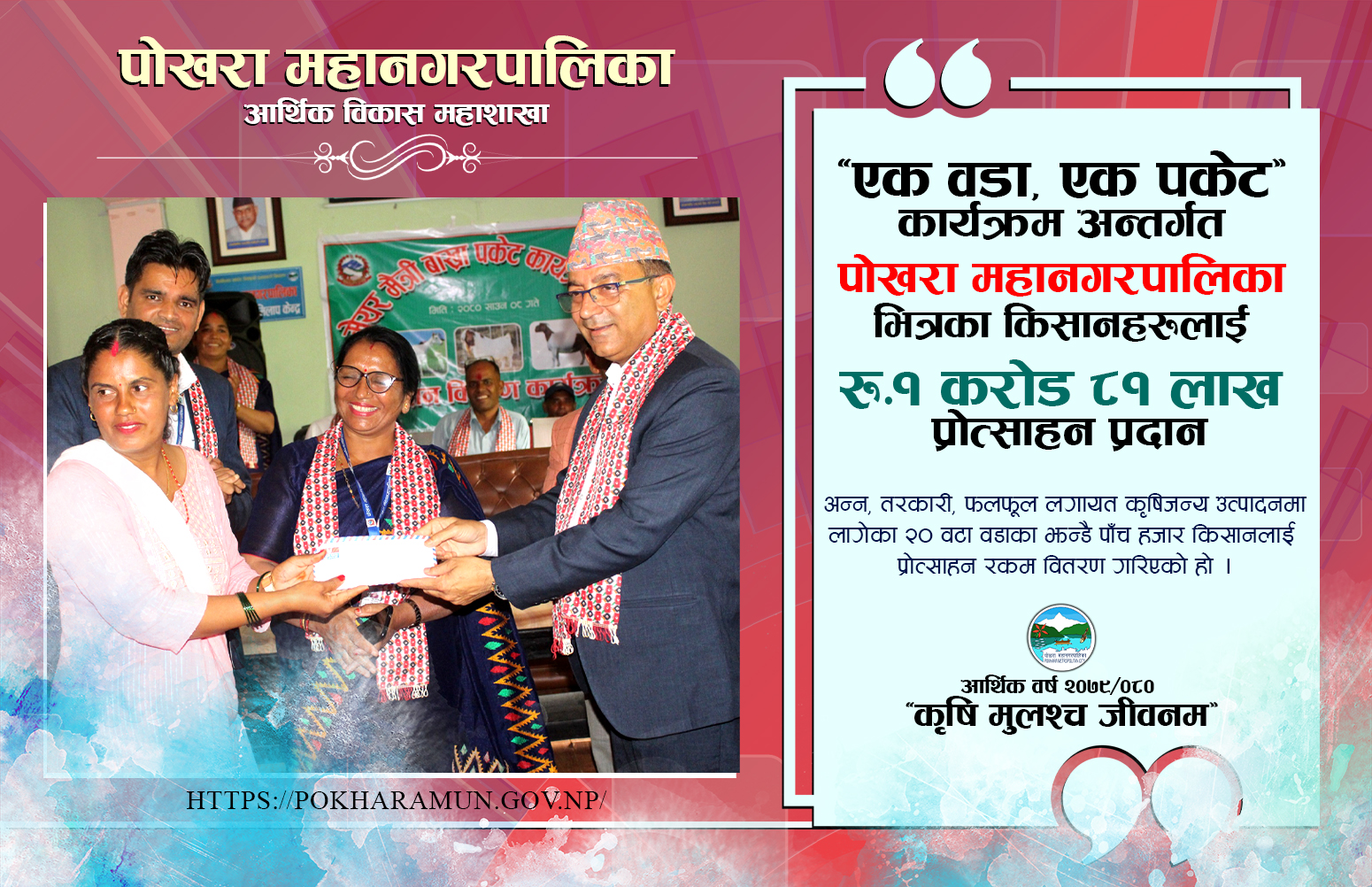 ‘एक वडा, एक पकेट’ कार्यक्रमअन्तर्गत पोखरा महानगरपालिकाका किसानले रु एक करोड ८१ लाख प्रोत्साहन रकम बुझेका छन् । अन्न, तरकारी, फलफूललगायत कृषिजन्य उत्पादनमा लागेका २० वडाका झन्डै पाँच हजार किसानलाई प्रोत्साहन रकम वितरण गरिएको महानगरको कृषि महाशाखाले जनाएको छ ।