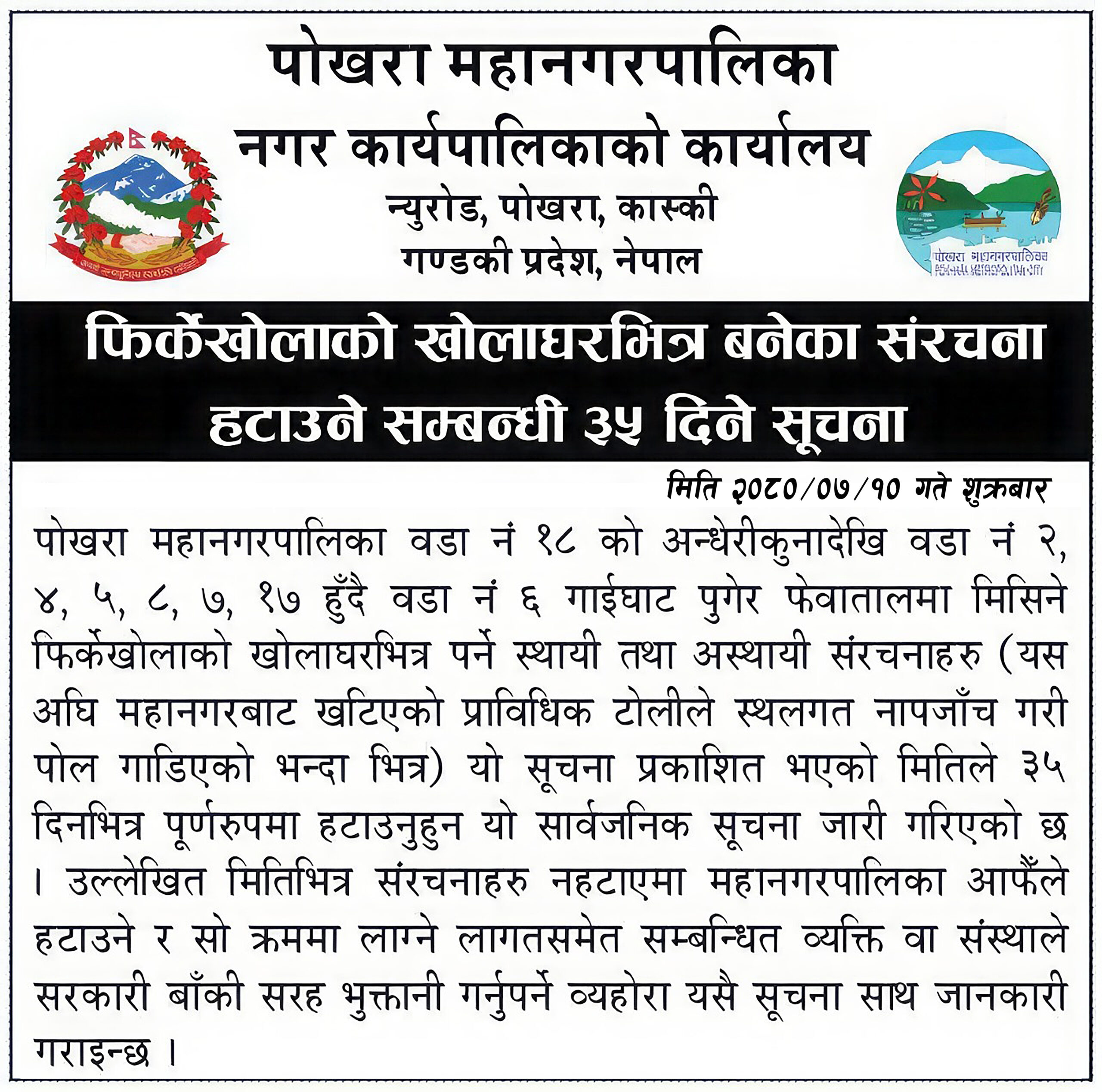 पोखरा महानगरपालिकाले फिर्केखोलाको खोलाघर भित्र निर्मित संरचनाहरू ३५ दिनभित्र खाली गर्न सार्वजनिक सूचना जारी गरेको छ । “फिर्केखोलाकोे खोलाघर नापजाँच प्रतिवेदन–२०८०” अनुसार खोलाघर भित्र परेका सवै खाले संरचनाहरू ३५ दिनभित्र हटाउन महानगरपालिकाले निर्देशनात्मक सूचना जारी गरेको हो ।