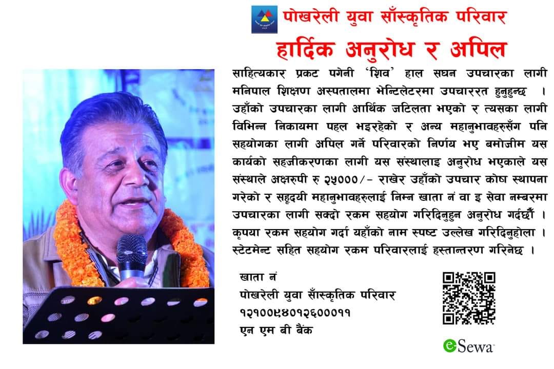 उनको उपचारमा आर्थिक जटिलता देखिएकाले सहयोगका लागि परिवारको आग्रहमा पोखरेली युवा सास्कृतिक परिवारले आह्वान समेत गरेको छ ।